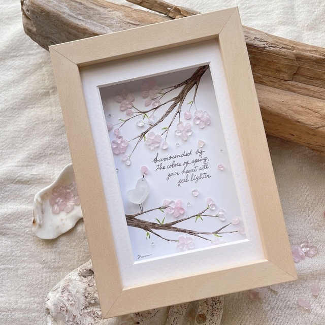 シーグラスに最後の物語を。 世界に1つだけの、言葉も贈るシーグラスアートを制作しております。 _______ シーグラス桜アート / 小さなぬくもり ............ 桜が咲き始め、春の訪れを感じる今日この頃 淡いピンクのローズクォーツを使って優しい桜を表現しました。 桜が満開に咲く枝の先 一羽の小鳥ちゃんがハートの花びらを見つけました♡ʾʾ 小鳥ちゃんが見つけた自分だけの春色ハート 大切に掲げる誇らしげな小鳥ちゃんのアートが完成しました。 ・ シーグラスも海のパワーを含んだパワーストーンと呼ばれますが、 本物のパワーストーンと掛け合わせてもっとパワーたっぷりの作品に仕上がりました。 ローズクォーツの石言葉には「真実の愛」「真実の美」「愛の告白」「美と健康」があります。 恋愛に関するパワーストーンのイメージもありますが、 恋愛だけではなく、不安や恐れなどのネガティブな感情を払拭して、円滑なコミュニケーションへと導く効果もあると言われております。 自信を持てないとき、仕事・家事・育児を頑張っているときなど、あらゆるシーンのお守りとして親しまれています。 そんなパワーを秘めたローズクォーツで咲かせた桜たち 光のあたり具合でキラキラといろんな表情を見せてくれます。 桜たちの煌めきにガラス粒もプラスする事で、 より一層光り輝くアートになりました。 木は透明水彩で描いております。 見ているだけで暖かな春の陽気を感じられる いつまでも枯れない桜のアートが完成しました。 . 暖かな陽気と優しい色に誘われて枝先に止まる一羽の小鳥ちゃん 桜の咲き誇る枝先の小さな小鳥ちゃんは、春そのものの様な暖かさを感じます♡ʾʾ 心穏やかにほっこりと温かくなる情景に、貴方の心もほっこり温かくなりますように、 そんな想いを込めてメッセージを書きました。 ˗ˏˋ A little warmth on the cherry blossom branches. Spring is definitely here. ˎˊ˗ 桜の枝に小さなぬくもり。春はちゃんとここにある。 . ●サイズ: 約11.7cm×16.7cm×3.2cm こちらは小さい額になります。サイズをご確認下さい。 壁掛け・スタンドどちらにも対応しております。 前面にはアクリル板の保護がある為、 埃や湿気から守ってくれるだけでなく、お手入れも楽々です。 ⚠︎写真を撮る際に反射してしまう為、撮影時はアクリル板を外しております。 大切なあの人へ お祝いしたいあの人へ 励ましたいあの人へ 自分へのごほうびに いやしの空間作りに シーグラスアートはいかがでしょうか? ・ ・ ・ ⚠︎ひとつひとつ丁寧に仕上げておりますが、万が一シーグラス等が剥がれてしまった際は、お手持ちの接着剤等で貼り付けていただけますと幸いです。 もしどうしても修正等必要な場合は、同梱しておりますショップカードより、 Instagram、公式LINE、またはメールにてご連絡ください。