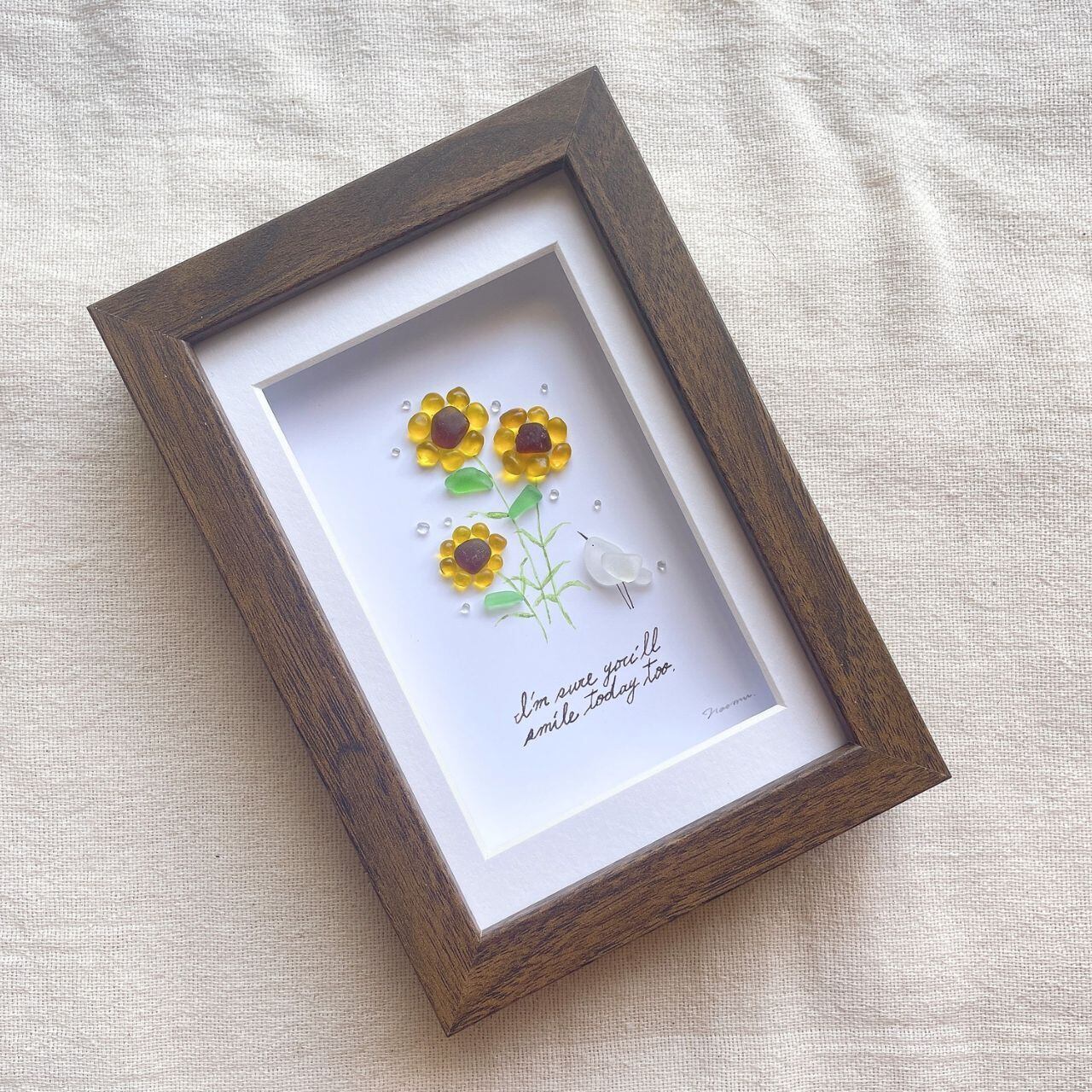 黄色のフロストガラスとシーグラスを使って色鮮やかに表現しました。